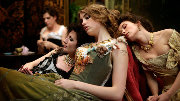 The smoky lounge area, scattered with maroon furniture and Victorian fixtures, does generate a sort of authentic atmosphere. As the girls swan around the room, flirting and draping themselves over the rich clientele, there’s a refined bawdiness which isn’t overtly “naughty”, rather restrained. But Bonello only half explores their profession; they occasionally chat about how they will never escape the brothel as the Madam will make sure their debts remain extortionate – but it’s a longing for freedom which is trapped in the literal exploration of sex in the film. Syphilis is seen as a consequence of their lifestyles, something deserved and inevitable, which creates a moral verdict that condemns the girls, literally, to death. There is no real empathic reflection or intelligence to Bonello’s film, only callous judgment, mildy attractive aesthetics and dubious confrontation.