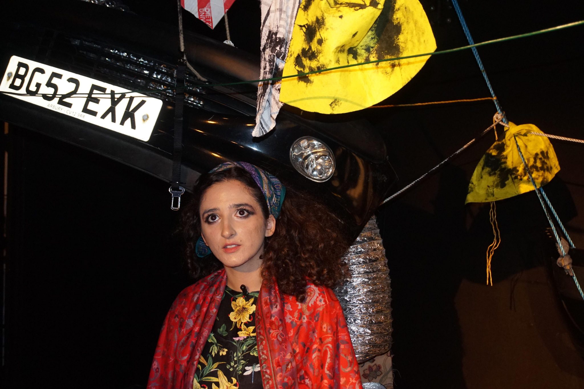 Wide-eyed and surrounded by suspended car bumpers, there is a certain whimsical nature to Leila’s performance as you first enter the theatre. With that same deer-in-headlights expression, she opens with the remark, “When I was a child, I was afraid that my mother would kill me.” Stuck in an imaginary traffic jam on the way to see her mother, Leila’s mother becomes the main topic of discussion, as her daughter offers us small glimpses into her background. Leila does not rush to make the presence of the civil war known; small comments about no one knowing her mother’s birth date lead to unanticipated tales of arson and religious persecution. These small fragments – stories about the wardrobe, the windows, and the sea – give structure to what feels like a drawn-out and rather tedious hour, which is not dissimilar to the traffic jam Leila finds herself sitting in.